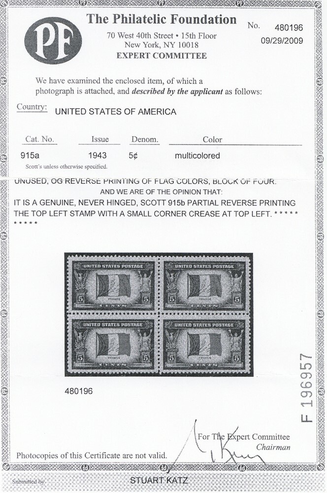 915b, 5¢ France Partial Reverse Printing of Flag Colors With PFC Stuart Katz