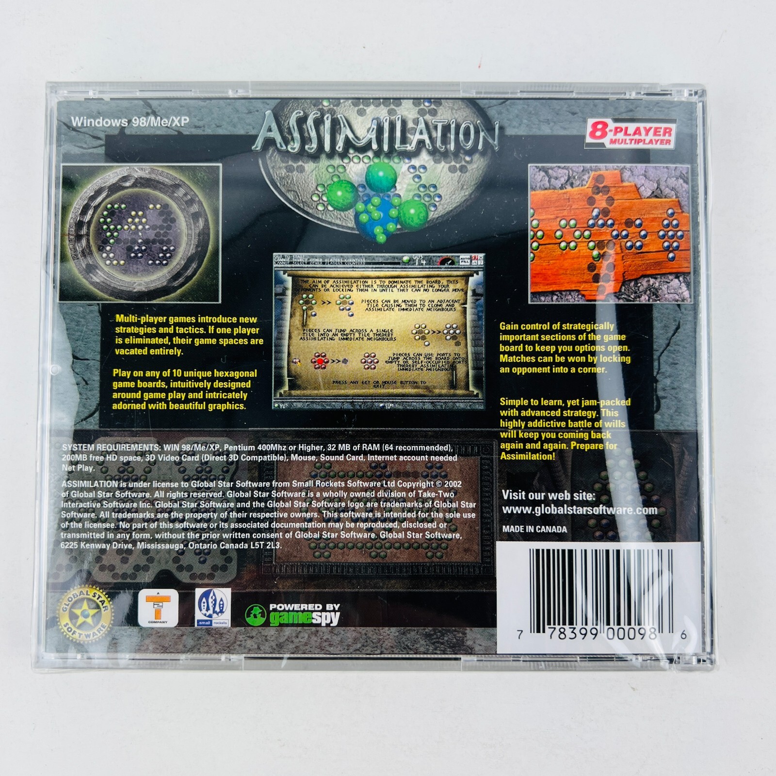 This is the Jewelcase version of the Assimilation PC Game - brand new and still sealed - strategy game - 8 player Multiplayer, rated E for everyone. Assimilation is a game about dominance similar to othello, taking over the board with coloured marbles. To do this you must jump, teleport or clone your way over your opponents. There are ten game boards total of varying shapes with holes where the marbles sit (like chinese checkers). Play against the computer AI or up to 7 of your friends.