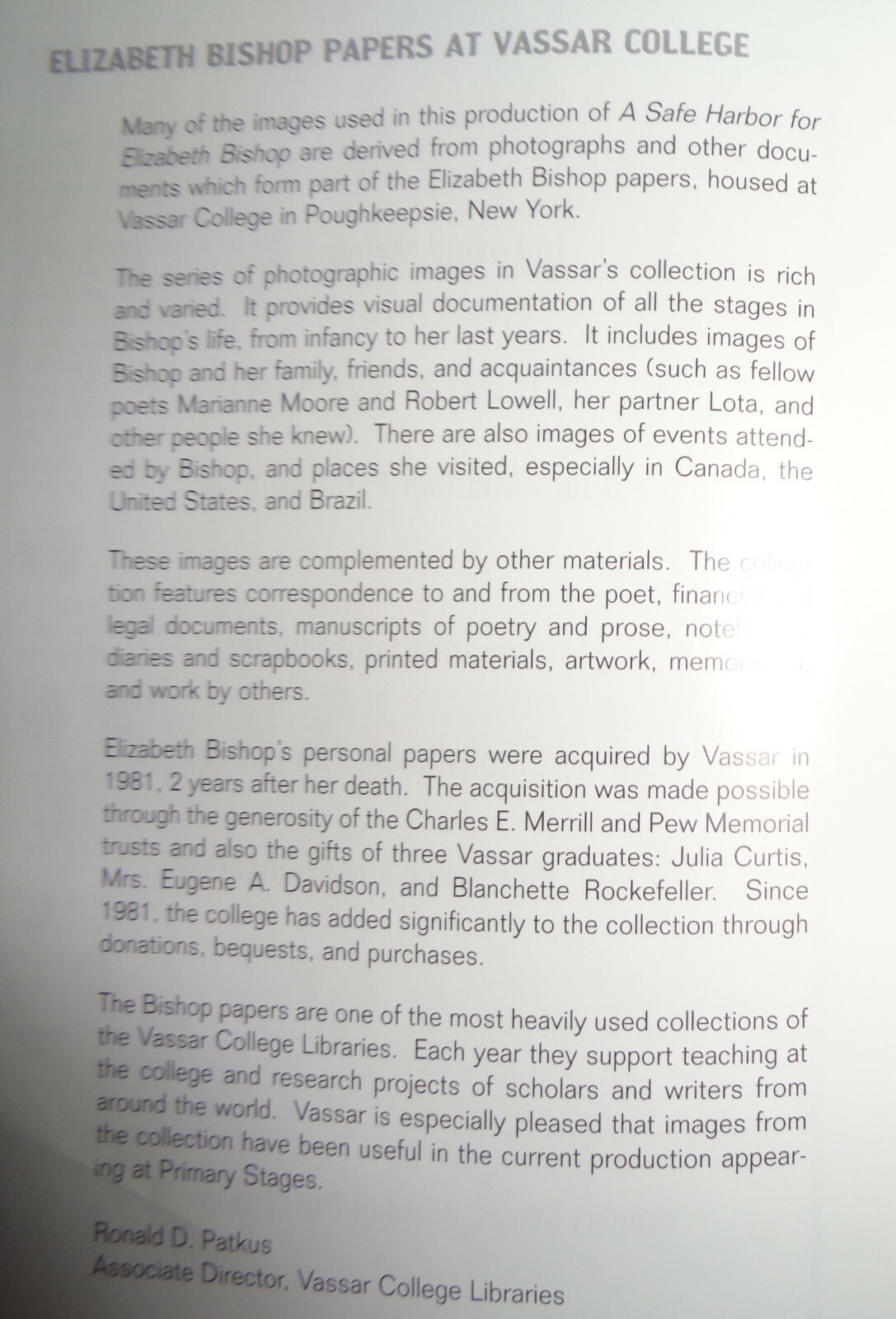 A Safe Harbor for Elizabeth Bishop, by Marta Goes - Souvenir Program - Primary Stages New York 2006