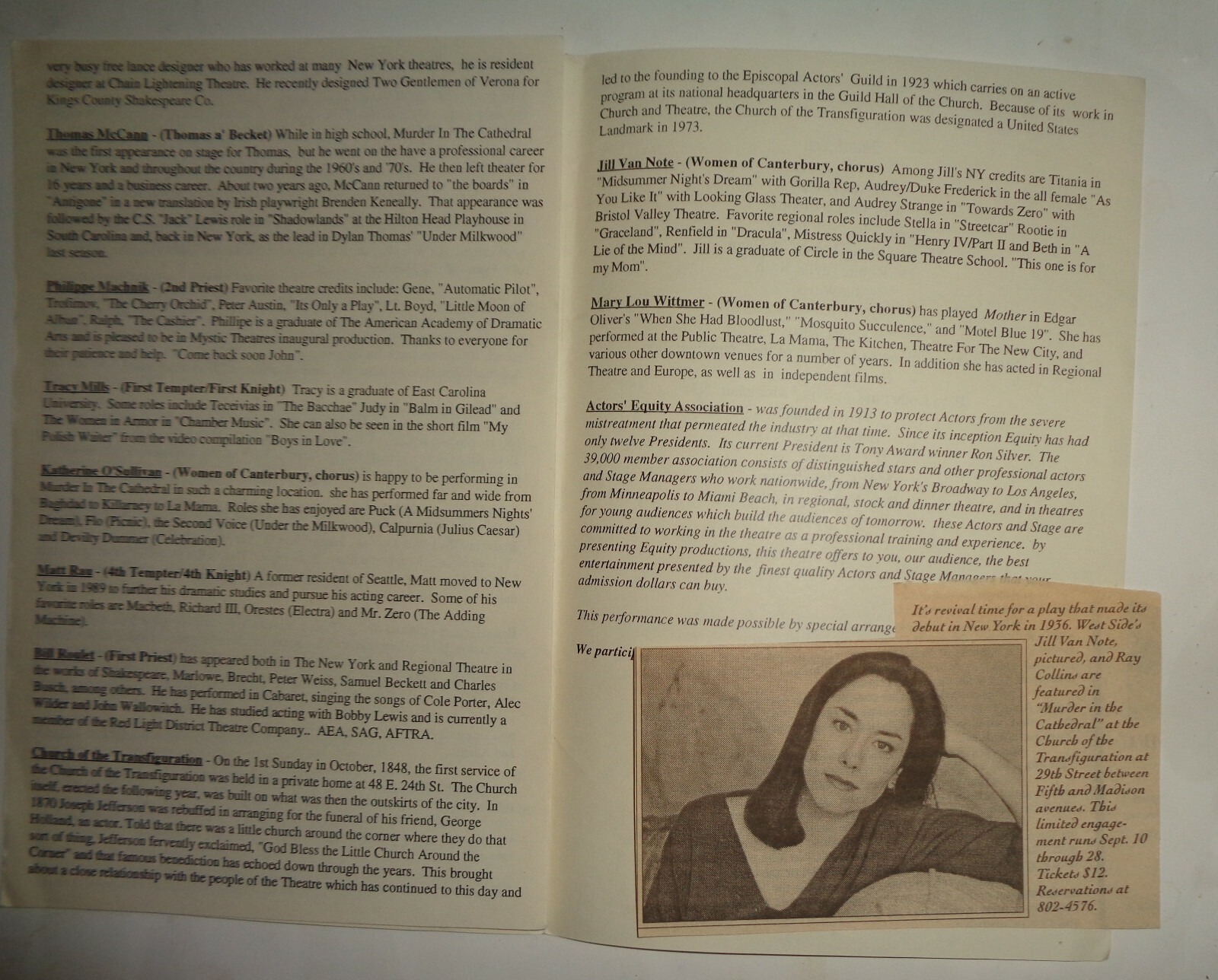 Mystic Theatre Presents "Murder In The Cathedral", starring Katherine O'Sullivan, Jill Van Note, Mary Lou Wittmer, Bill Roulet, John Flaherty, Norm Anderson, Jon-Michael Hernandez, Thomas McCann, Tracy Mills, Ray Collins, Jim DeMonic, Matt Rau. Laid in is a newspaper clipping about the play, with photo of Jill Van Note. ; 8vo; 8 pages.